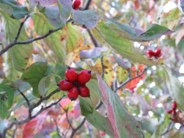 よく通る道の街路樹が紅葉し始めた。赤い実をたくさんつけている。晩春初夏の頃、白や桃色の花で華やかだったハナミズキが結実したのだ。
