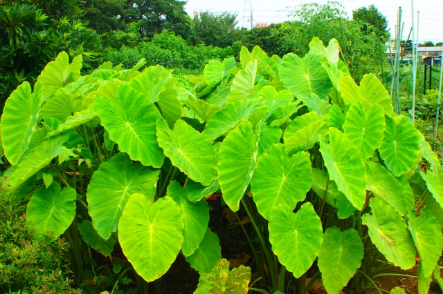 サトイモの葉に隠れて
